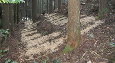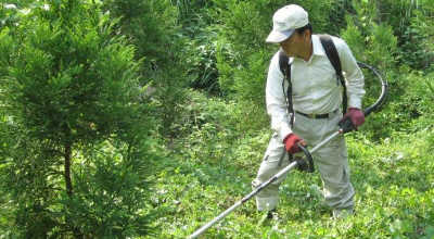 植樹後6~7年間は幼木が雑草に覆われないようにするため、毎年7~9月にかけて木の周りの雑草を刈りこむ。非常にきつい仕事。一人1日約0.1haが作業の目安。
